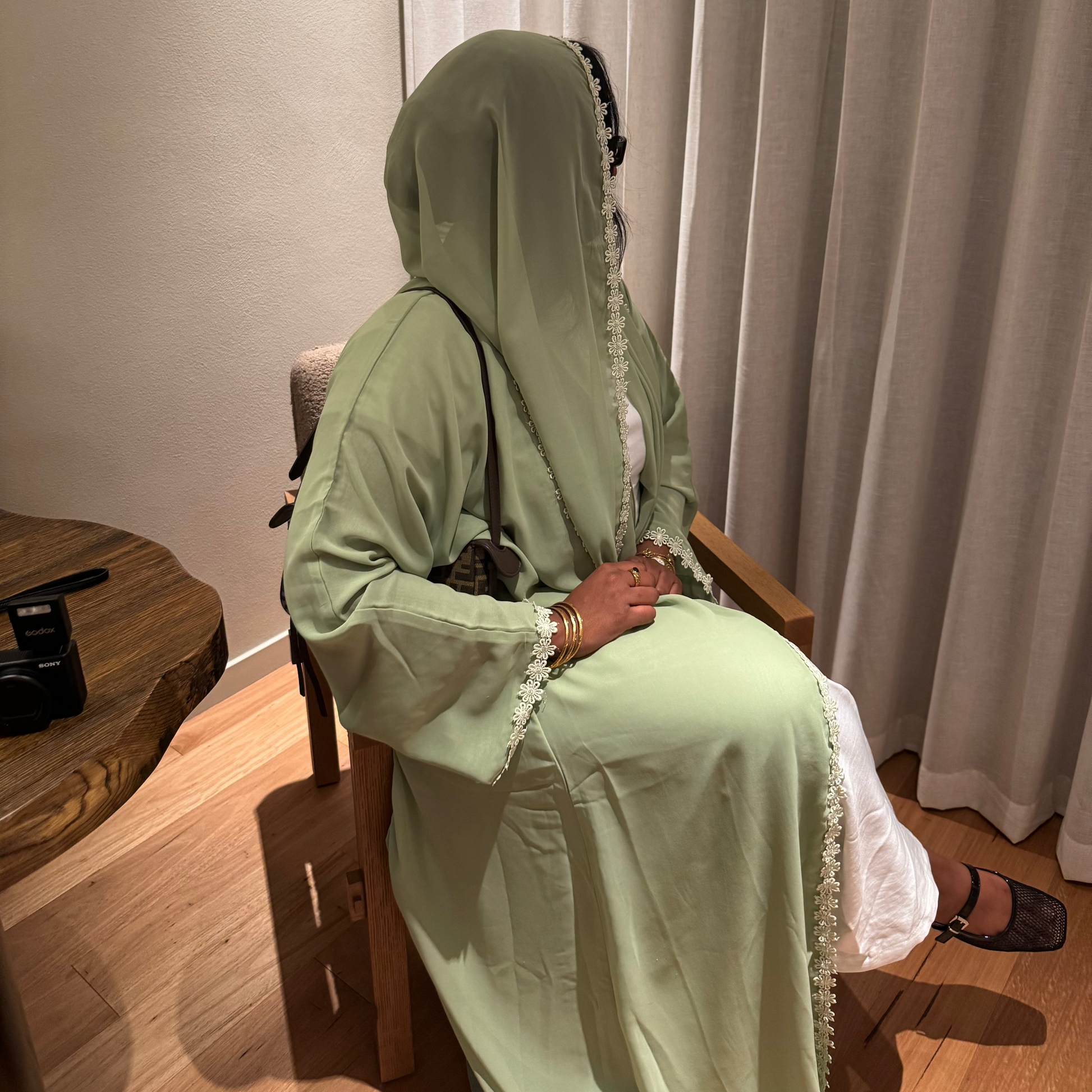 The Light Sage abaya features a soft green hue that evokes calm, clarity, and natural elegance. Crafted from lightweight chiffon, it offers breathable comfort, ideal for warm summer days.